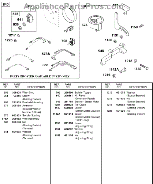 Parts for Briggs & Stratton 326431-0198-99: Panel Kit, Gages, Wires Parts