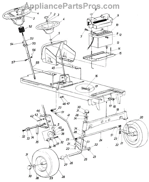 Drag link connects the steering gear to the front axle on garden tractors. Replace if bent, worn, or missing for proper steering alignment and control.
