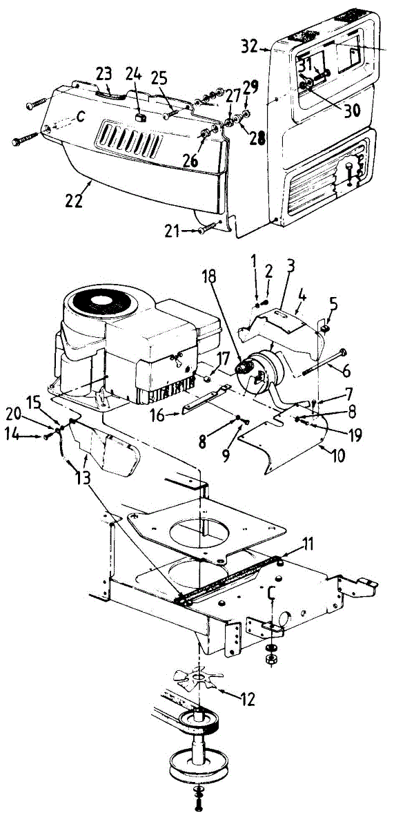 Hex screw fastener for securing lawn mower components. Replace if stripped, rusted, or missing to ensure proper assembly and equipment stability.