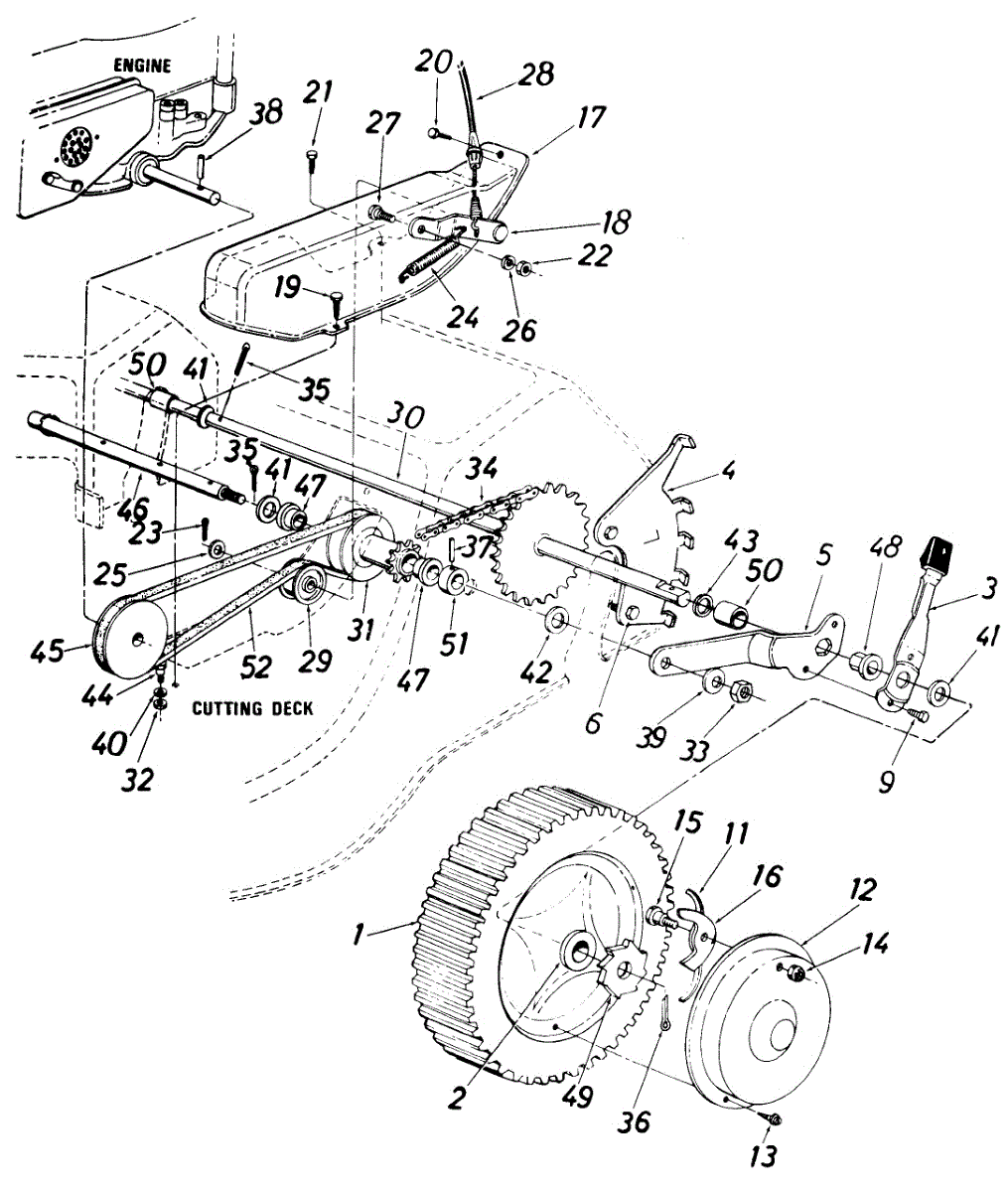 Hex screw fastener for securing lawn mower components. Replace if stripped, rusted, or missing to ensure proper assembly and equipment stability.
