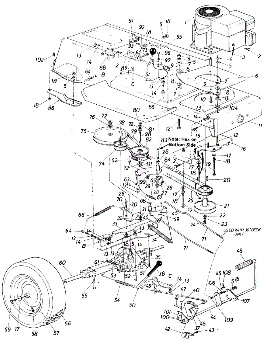 Hex screw for lawn mowers and tractors. Secures deck, wheels, or frame components. Replace if stripped, corroded, or missing for proper assembly.