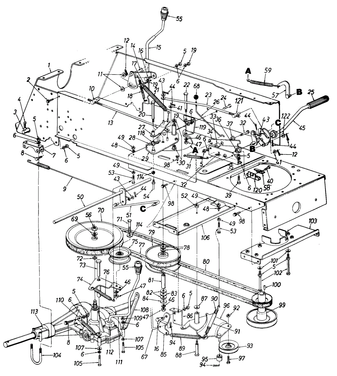 Self-tapping screw for lawn mowers and garden equipment. Secures metal, wood, and plastic parts. Replace if stripped, missing, or corroded.