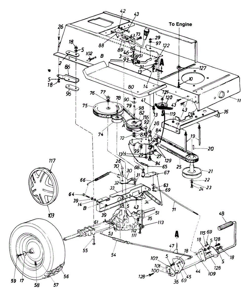 Parts for Mtd 133M670G736 / 1993: Pedal Assembly / Wheels, Rear / Drive / Frame, Lower Parts