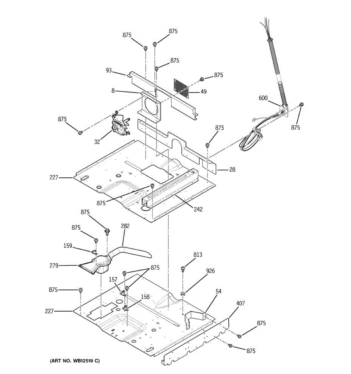 Oven vent box assembly that routes hot air and steam from the cooking cavity. Replace if cracked, damaged, or missing to restore proper ventilation.