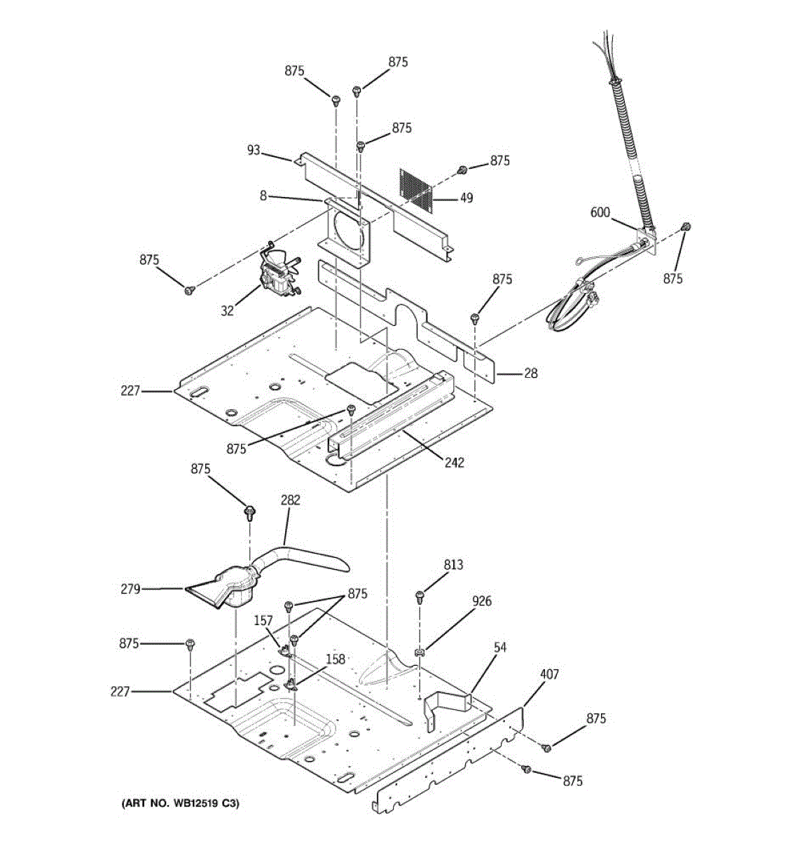 Oven vent box assembly that routes hot air and steam from the cooking cavity. Replace if cracked, damaged, or missing to restore proper ventilation.