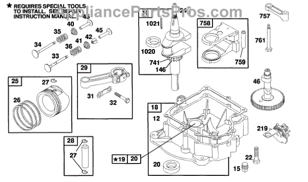 Parts for Briggs & Stratton 258702-0104-01: Piston Group, Sump Base, Cam Parts