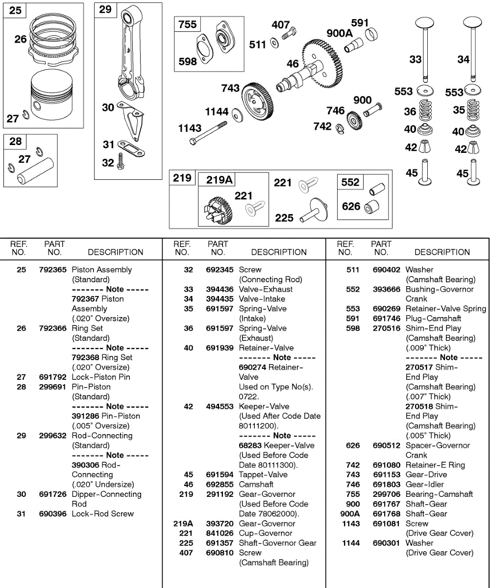 Parts for Briggs & Stratton 326431-0158-99: Piston, Rings, Connecting Rod, Camshaft, Valves Parts
