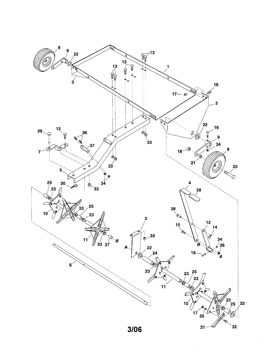 Wheel bracket assembly for aerator attachments. Mounts and supports the wheel mechanism. Replace if bracket is cracked, bent, or broken from impact damage.