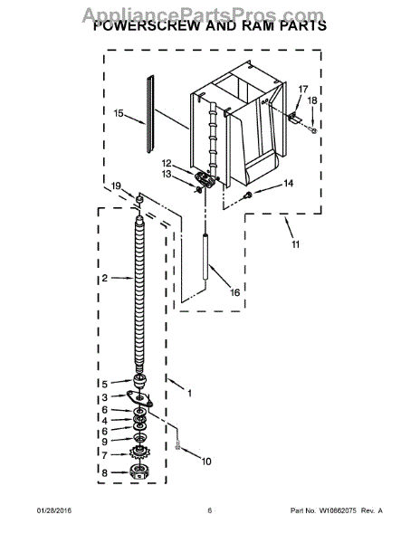 The Power Nut Kit is an OEM replacement part for Whirlpool trash compactors. It is designed to attach to the side of the ram and is threaded to interact with the power screw. As the power screw rotates, it feeds through the power nut, pulling the ram down to compact the trash.