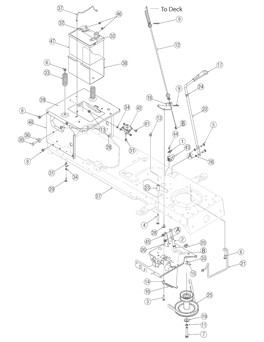 Secures the battery in your lawn tractor or riding mower. Replace if cracked, broken, or missing to prevent battery movement and secure mounting.