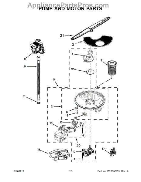 The Diverter Cover is an OEM replacement part for Whirlpool dishwashers. It is a protective plastic shield that covers the diverter valve, which controls the path of water flow during different wash cycles. The cover helps protect internal components from debris while allowing the valve underneath to operate smoothly. Causes of a bad diverter cover can include cracks or breaks due to impact, loosening of mounting screws over time, or discoloration and wear of the plastic material. Symptoms of a bad diverter cover include: