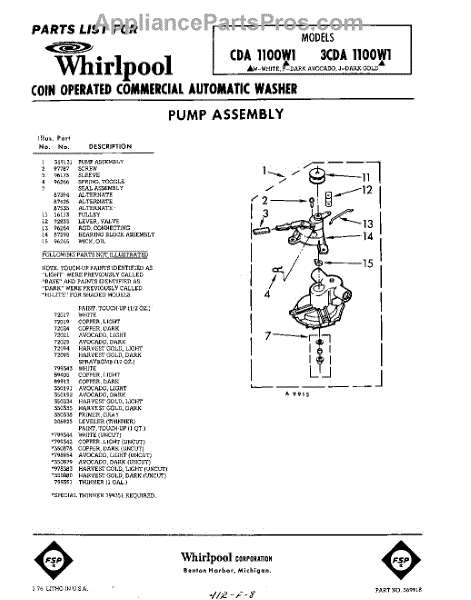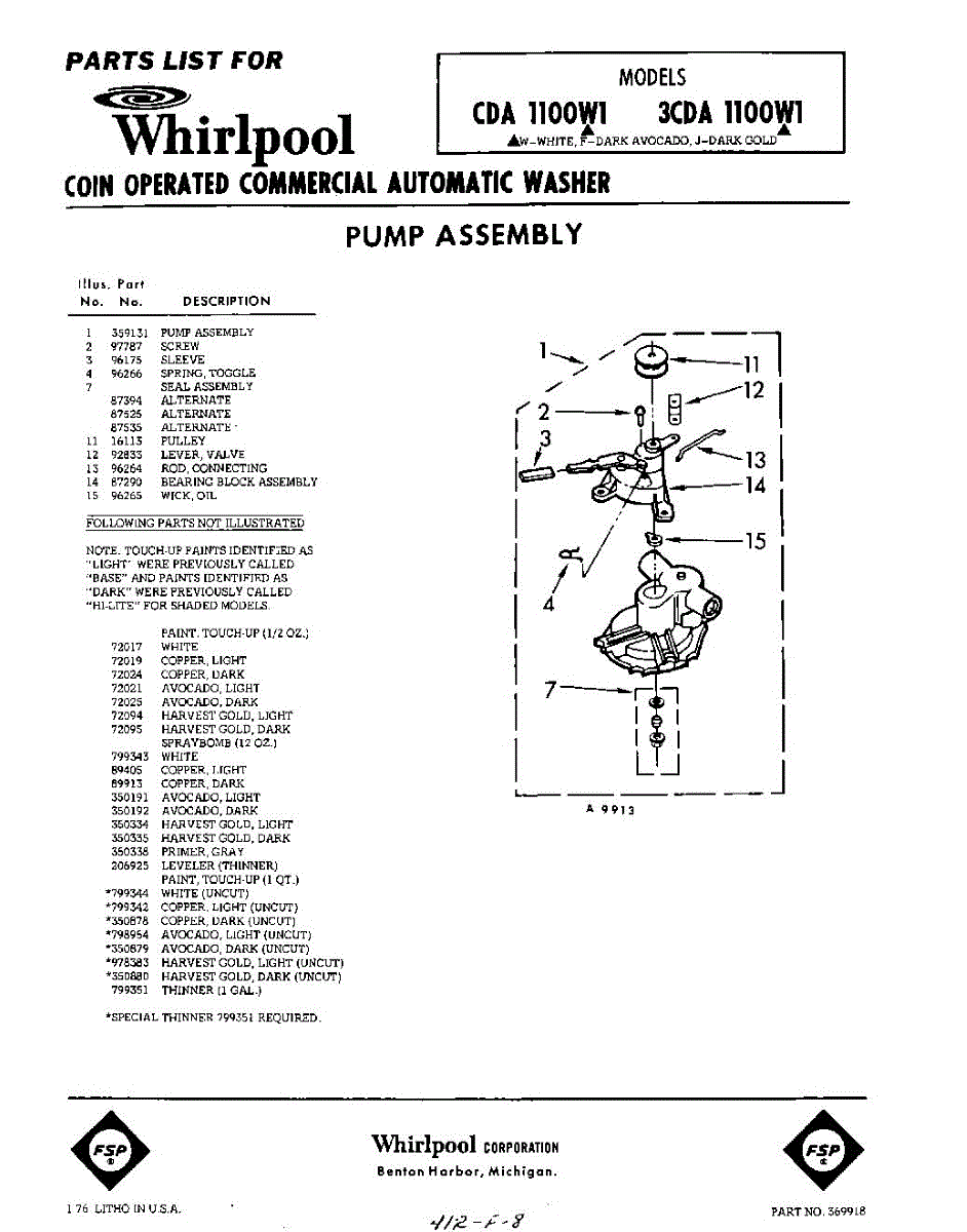 Parts for Whirlpool CDA1100W1: 01 - Pump Assembly Parts