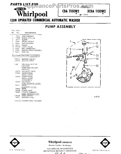 Parts for Whirlpool CDA1100W2: 01 - Pump , Lit / Optional Parts