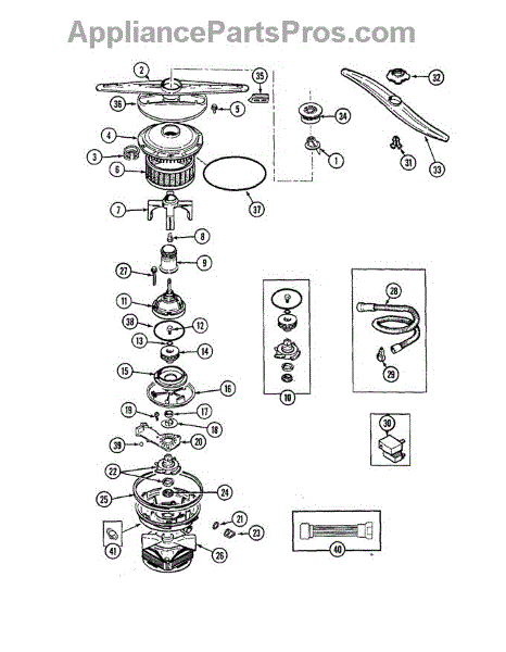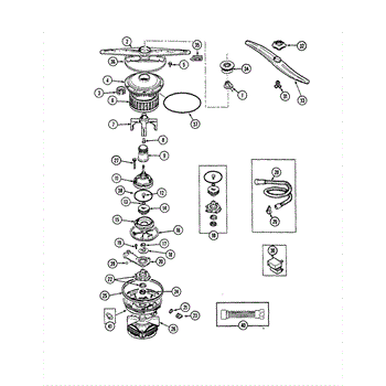 This dishwasher impeller assembly mounts on the circulation pump and pressurizes wash water for the spray arms. Replacing a worn or damaged impeller restores proper spray pressure, cleaning performance, and quieter operation.