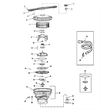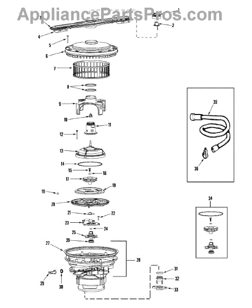 This dishwasher impeller assembly mounts on the circulation pump and pressurizes wash water for the spray arms. Replacing a worn or damaged impeller restores proper spray pressure, cleaning performance, and quieter operation.