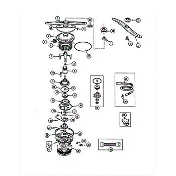 This dishwasher impeller assembly mounts on the circulation pump and pressurizes wash water for the spray arms. Replacing a worn or damaged impeller restores proper spray pressure, cleaning performance, and quieter operation.
