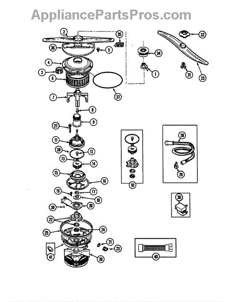 This dishwasher impeller assembly mounts on the circulation pump and pressurizes wash water for the spray arms. Replacing a worn or damaged impeller restores proper spray pressure, cleaning performance, and quieter operation.