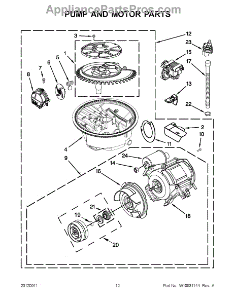 The Volute with Seal is an OEM part for Whirlpool dishwashers. This part directs water flow within the dishwasher's pump, ensuring efficient circulation and pressure during the wash cycle. The seal helps to prevent leaks by maintaining a tight closure between the volute and other pump components.