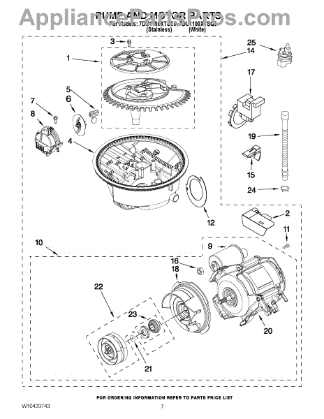 This replacement part is a dishwasher pump and motor assembly. The dishwasher pump and pump motor circulate water through the dishwasher's spray arm. When the spray arms aren't spraying properly, this could mean that it's time for a new pump and motor assembly. Luckily replacing this part is a relatively simple process.Start by making sure the dishwasher is unplugged. After that shut off the water supply going to the dishwasher. Then disconnect the drain line from the garbage disposal or sink drain. Open the dishwasher door and pull out the bottom dish rack. Remove the upper dishrack from its track. Release the spray arm on the bottom of the washer. Then proceed to release the feed tube clips. Using a nut driver remove the bottom access panel and tow panel. Pull them out to remove them. Remove the power cable from the junction box, and disconnect the supply line from the inlet valve. Proceed to pull the dishwasher out of the counter. Tilt the dishwasher on its side and pull the hose from the drain pump. Remove the wire harness from the pump. Disconnect wires from diverter motor and circulation motor. Once complete, proceed to tilt the dishwasher upright and remove the pump and motor assembly from the bottom of the dishwasher. Replace with the new assembly.This replacement part is compatible with Whirlpool, Maytag, KitchenAid, Jenn-Air, Amana, Magic Chef, Admiral, Norge, Roper, and Sears/Kenmore brand dishwashers.