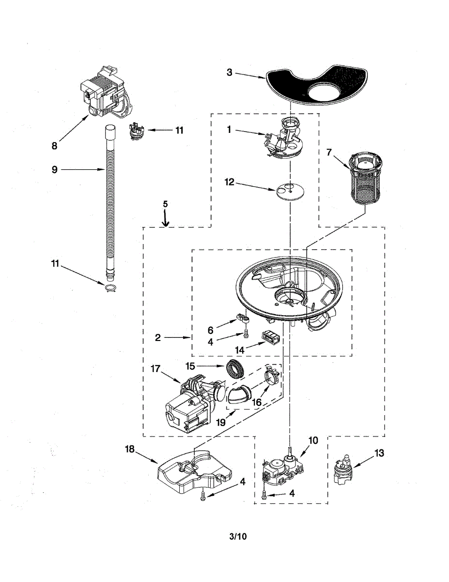 Traps food particles and debris during wash cycles to keep water clean. Replace if clogged, cracked, or dishwasher performance declines. Verify fit.
