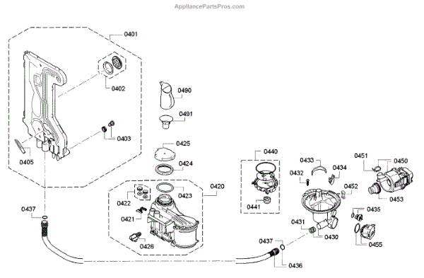 • Channels wash and rinse water to the spray arms and wash assembly