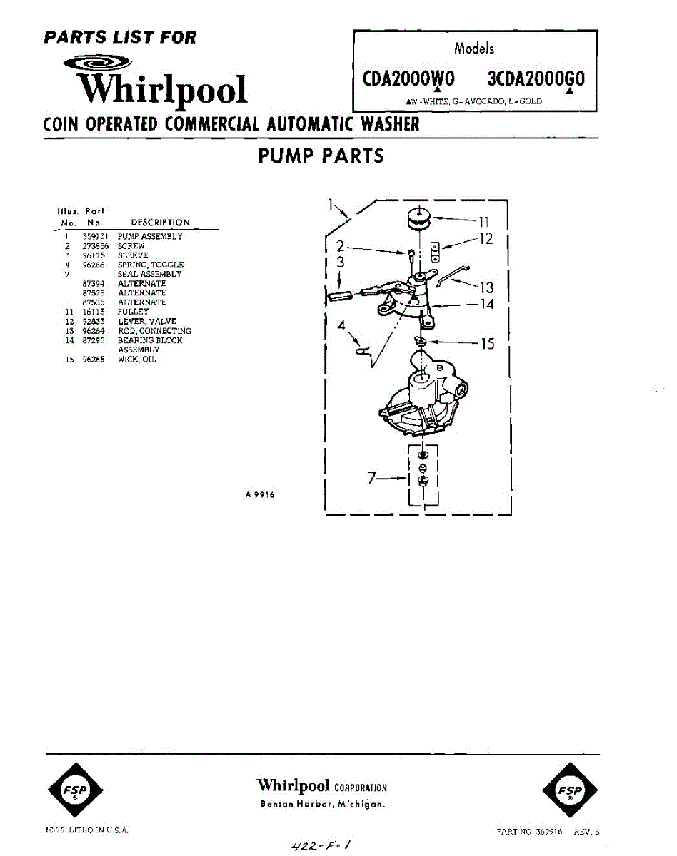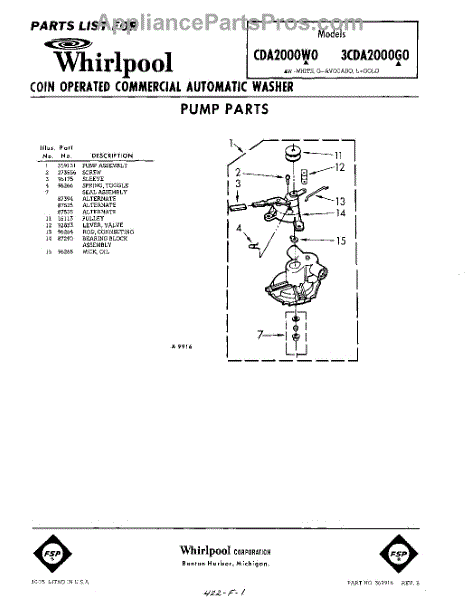 Parts for Whirlpool 3CDA2000W0: 01 - Pump Parts