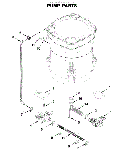 The Water Pump is an OEM part compatible with Whirlpool washing machines. It is responsible for circulating water during wash cycles, both picking up water from the tub and releasing it through the dispenser and hoses.