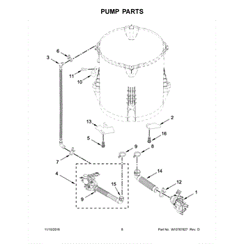 The Drain Pump is an OEM replacement part for Whirlpool washing machines. It is responsible for evacuating water from the washer tub at the end of each cycle. The drain pump automatically kicks on to remove dirty water through the drain hose. Causes of a bad drain pump can include a clogged impeller preventing proper drainage, failing motor windings that cause inadequate pumping, or physical damage affecting pump operation. Symptoms of a bad drain pump include: