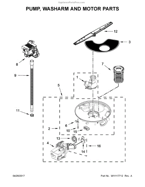 The Pump and Motor Assembly is an OEM part for Whirlpool dishwashers. It is responsible for draining dirty water and spraying water onto dishes during cycles. This pump utilizes a compact motor to induce water through inlet and outlet ports for effective cleaning action.