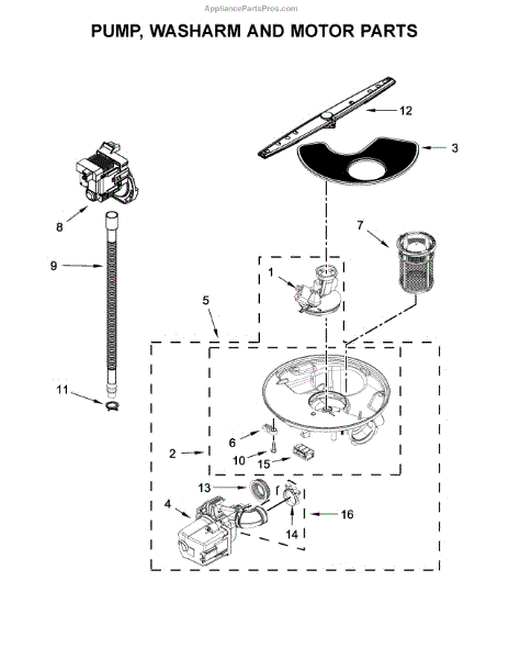 The Pump and Motor Assembly is an OEM part for Whirlpool dishwashers. It is responsible for draining dirty water and spraying water onto dishes during cycles. This pump utilizes a compact motor to induce water through inlet and outlet ports for effective cleaning action.