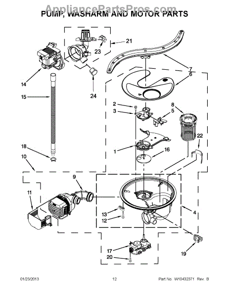 Note: Includes wire harness WPW10083167, Drain cap part number WPW10193605, and the shaft seal has been incorporated into sump housing, not available separately.