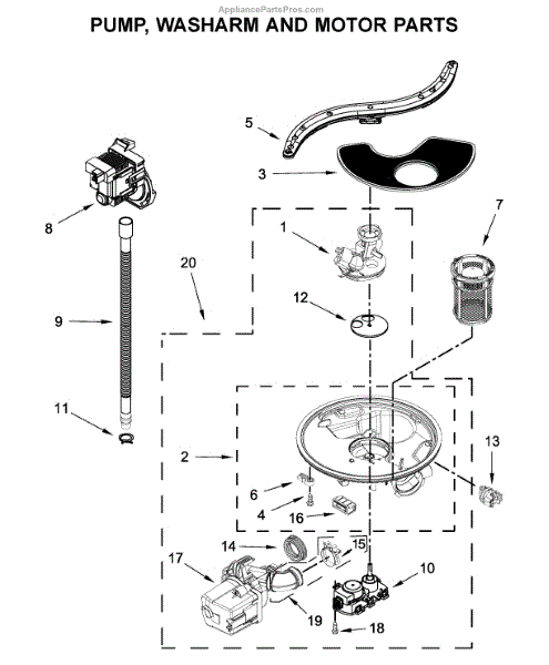 The Sump and motor assembly is an OEM component for Whirlpool dishwashers. Located at the bottom of the dishwasher tub, this assembly contains both the pump and motor that circulate water during the wash and rinse cycles. Causes of a bad sump and motor assembly include mineral or grit buildup inside the pump/motor housing that causes reduced water flow, worn-out seals or impellers in the pump, or failure of the motor components. Symptoms of a bad sump and motor assembly include: