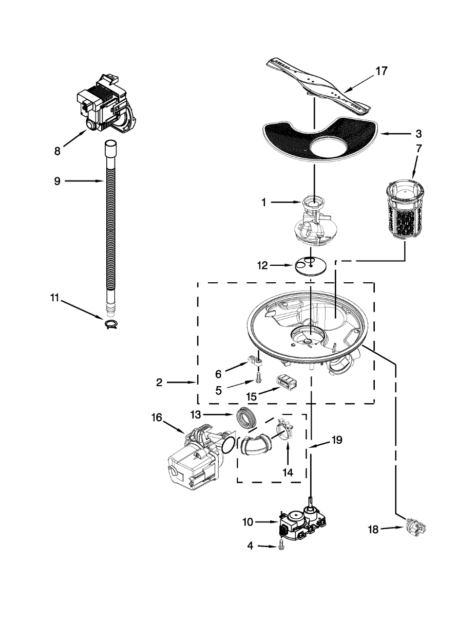 Traps food particles and debris during wash cycles to keep water clean. Replace if clogged, cracked, or dishwasher performance declines. Verify fit.