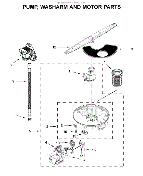 The Pump and Motor Assembly is an OEM part for Whirlpool dishwashers. It is responsible for draining dirty water and spraying water onto dishes during cycles. This pump utilizes a compact motor to induce water through inlet and outlet ports for effective cleaning action.