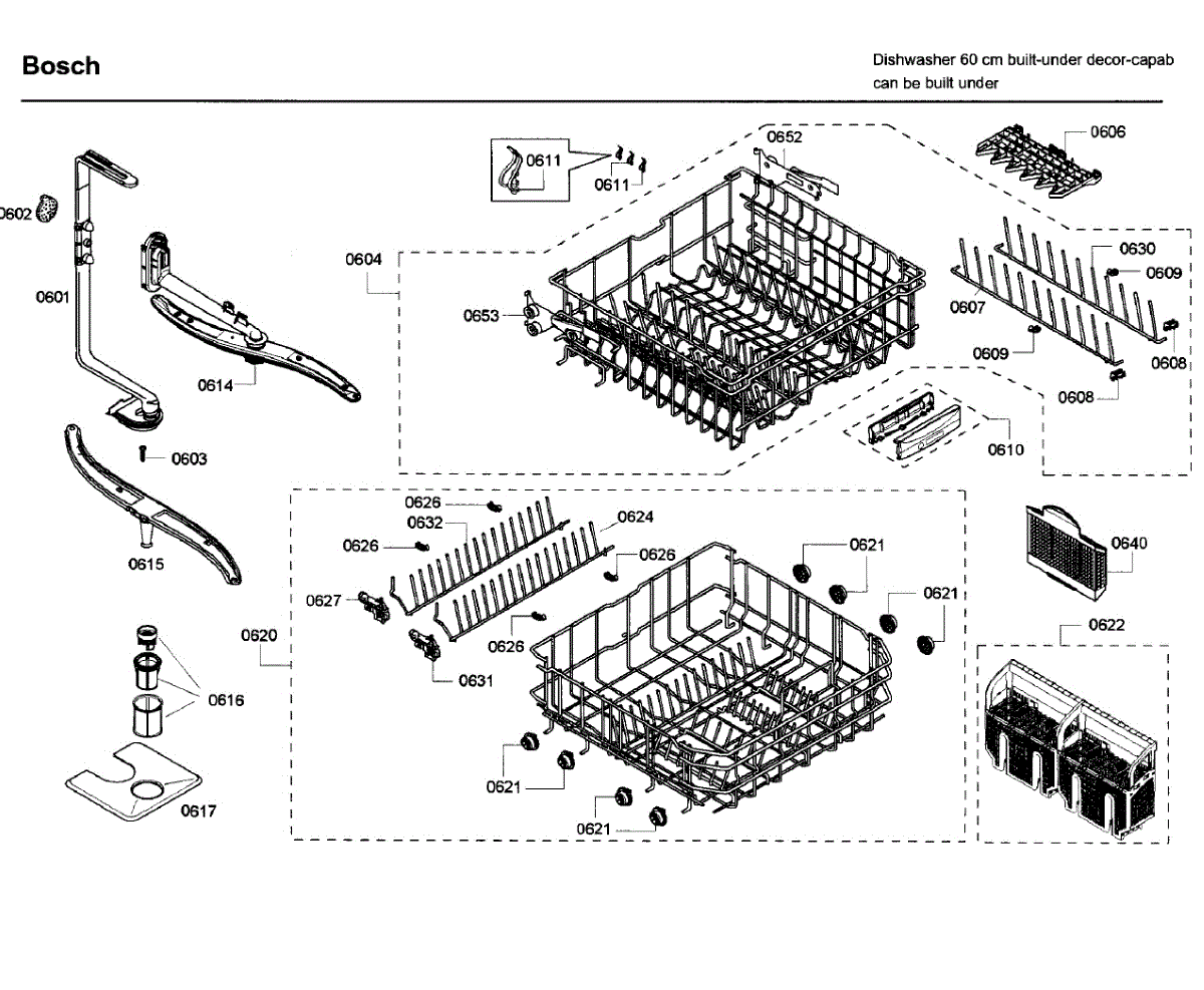 Replacement silverware basket for Bosch dishwashers. Sits in the lower rack to organize utensils during wash cycles. Order if yours is cracked or missing.