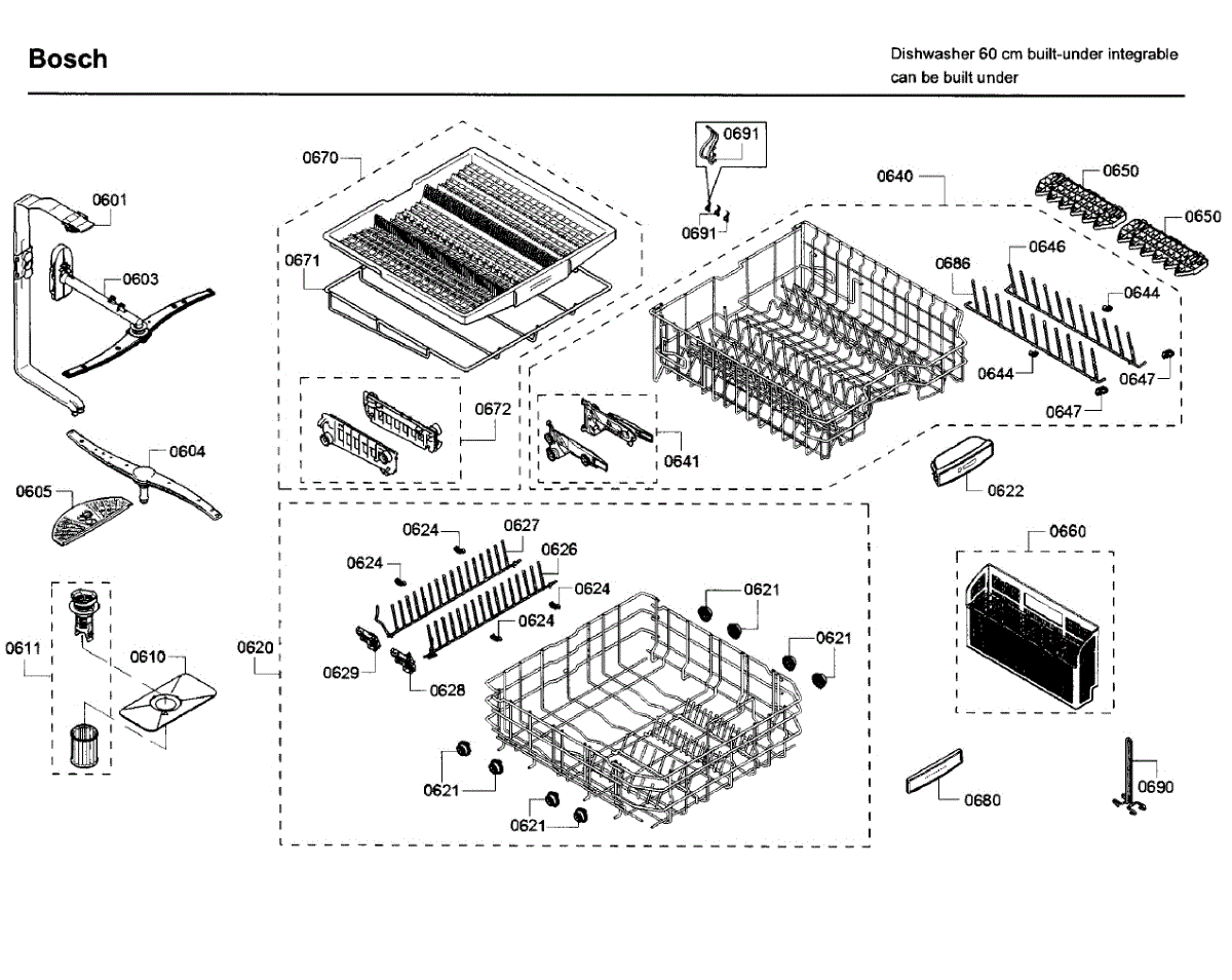 Cutlery basket frame for Bosch dishwashers. Organizes and supports forks, knives, and spoons. Replace if cracked, broken, or damaged from wear.