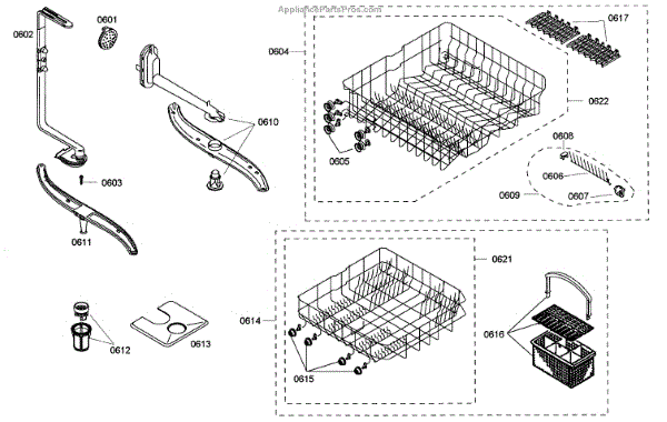The Silverware Basket Assembly is an OEM part for Bosch dishwashers. This basket is located in the lower rack and is used to hold utensils securely during the wash cycle.