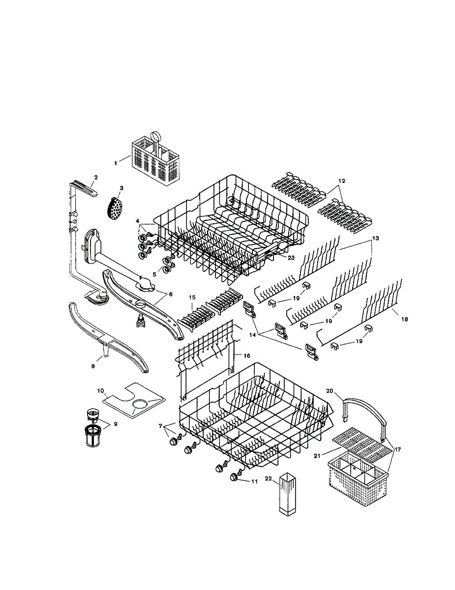 Lower dishrack assembly for dishwashers. Slides in and out for easy loading. Replace when cracked, rusted, or prongs are broken or missing.