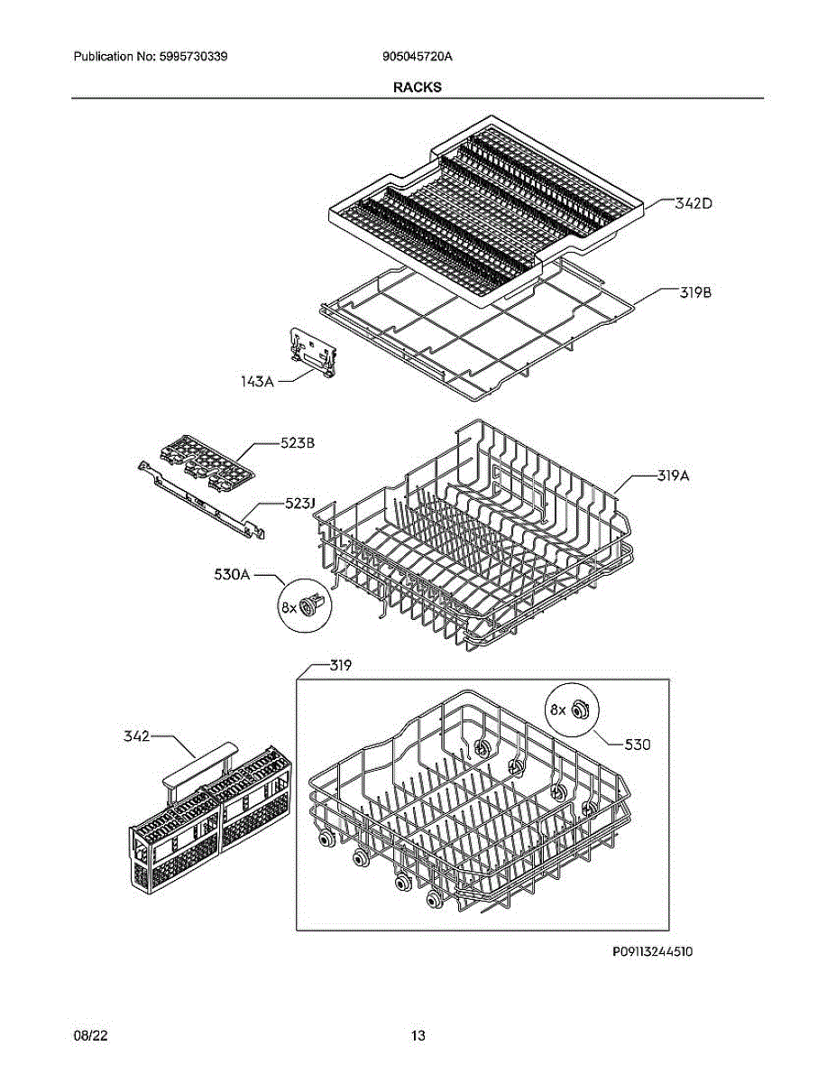 Upper rack assembly for dishwashers. Holds dishes, cups, and glassware during wash cycles. Replace when rack is cracked, broken, or tines are damaged.