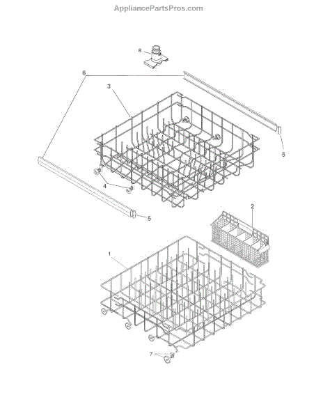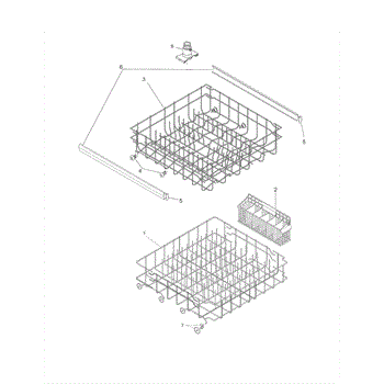 Upper dishrack assembly for dishwashers. Holds dishes during wash cycles. Replace when rack shows rust, peeling coating, broken tines, or structural damage.