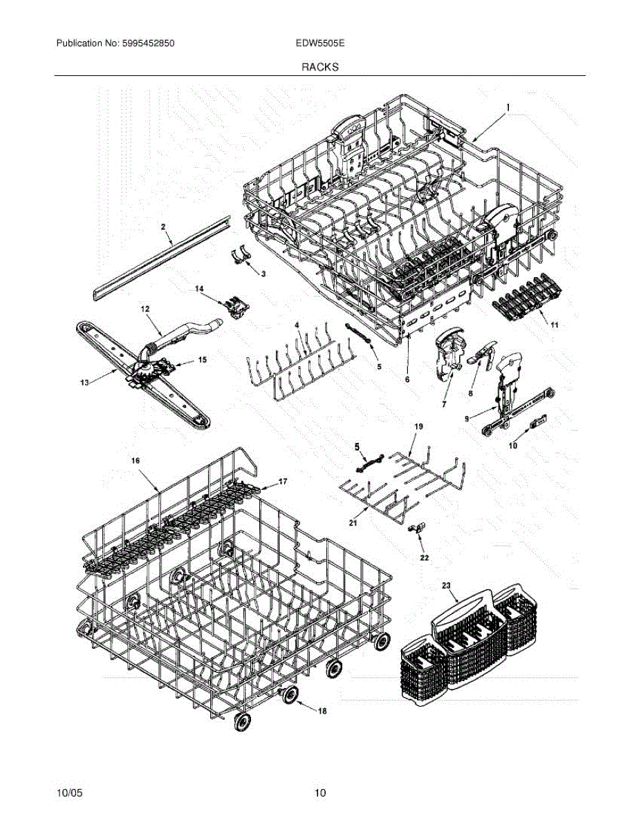 Lower dish rack for dishwashers. Replaces damaged, cracked, or broken lower racks. Holds plates, bowls, and cookware during wash cycles.