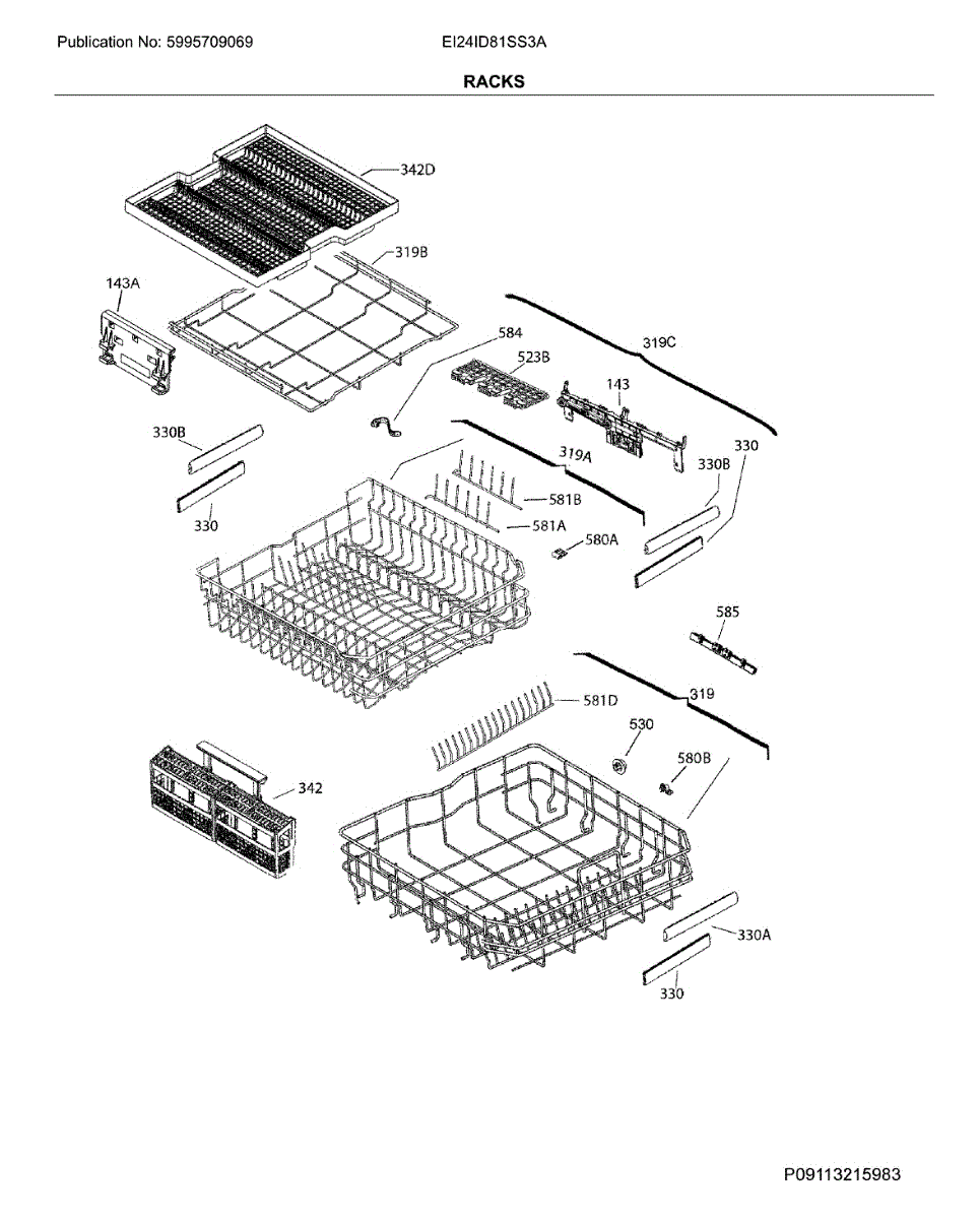 Upper rack assembly for dishwashers. Replaces cracked, broken, or worn racks that no longer hold dishes securely. Complete assembly for top position.