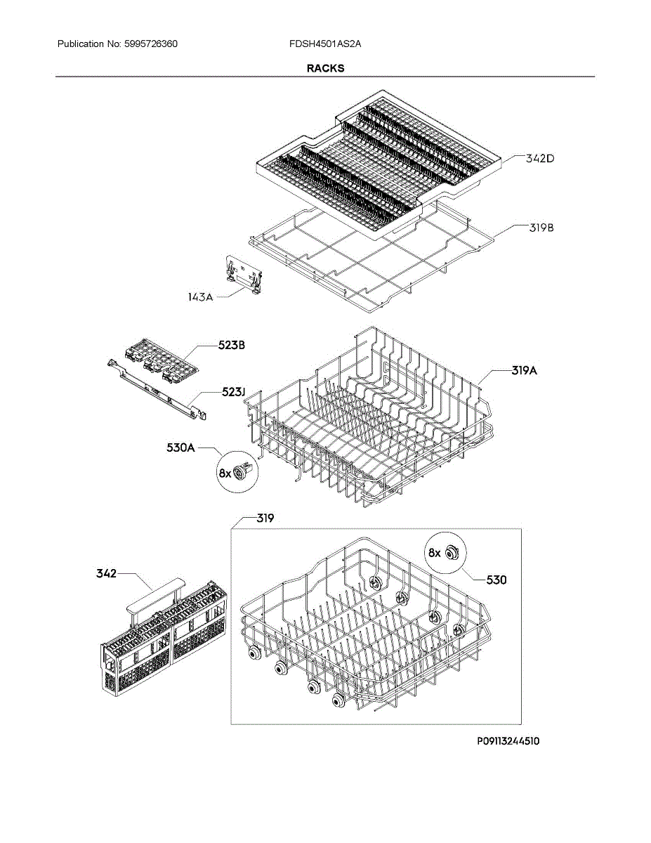 Upper rack assembly for dishwashers. Holds dishes, cups, and glassware during wash cycles. Replace when rack is cracked, broken, or tines are damaged.