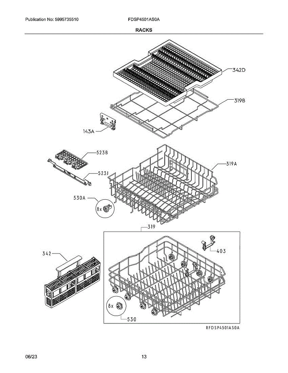 Upper rack assembly for dishwashers. Holds dishes, cups, and glassware during wash cycles. Replace when rack is cracked, broken, or tines are damaged.