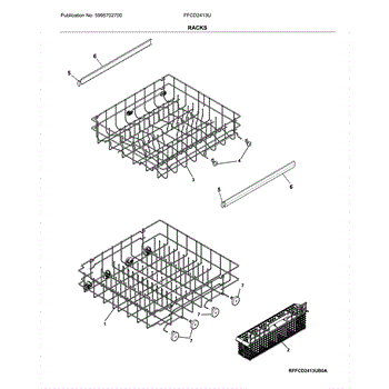 The Dishwasher Rack Assembly is an OEM part for Frigidaire dishwashers. It provides an adjustable racking system inside the dishwasher tub to accommodate varying sizes of dishes, utensils, and cookware on multiple shelf levels. The rack assembly measures about 22"x 21"x 9" including the wheels. Symptoms of a bad rack assembly include:
