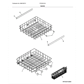 The Dishwasher Rack Assembly is an OEM part for Frigidaire dishwashers. It provides an adjustable racking system inside the dishwasher tub to accommodate varying sizes of dishes, utensils, and cookware on multiple shelf levels. The rack assembly measures about 22"x 21"x 9" including the wheels. Symptoms of a bad rack assembly include: