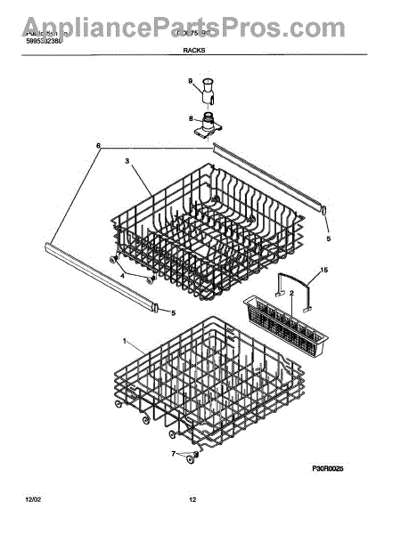 Replace your dishwasher's lower dishrack assembly if it's rusted, cracked, or has broken tines. This gray rack holds dishes securely during wash cycles.