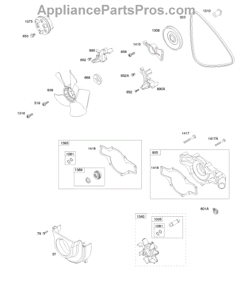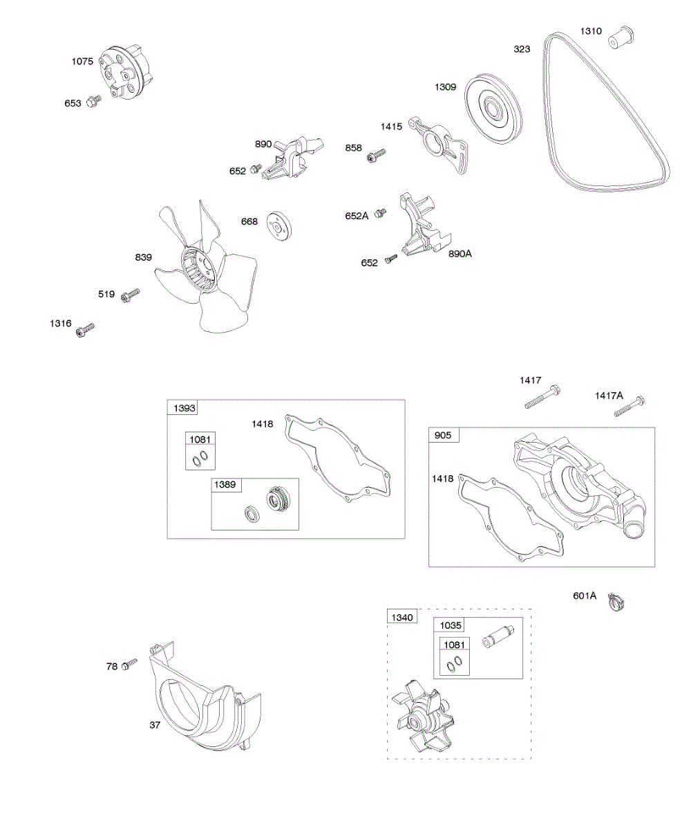 Parts for Briggs & Stratton 611177-0100-E1: Radiator Fan, Impeller, V-Belt, Water Pump Case Parts