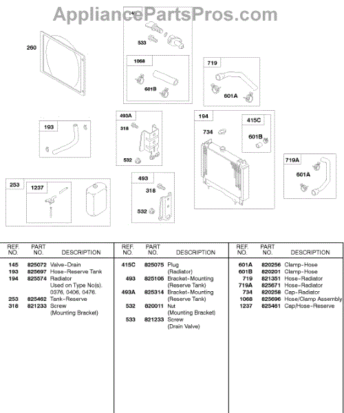 Parts for Briggs & Stratton 522447-0478-E2: Radiator, Hoses, Mounting Brackets Parts