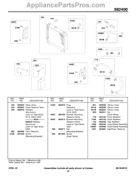 Parts for Briggs & Stratton 582447-0232-E2: Radiator, Hoses Parts